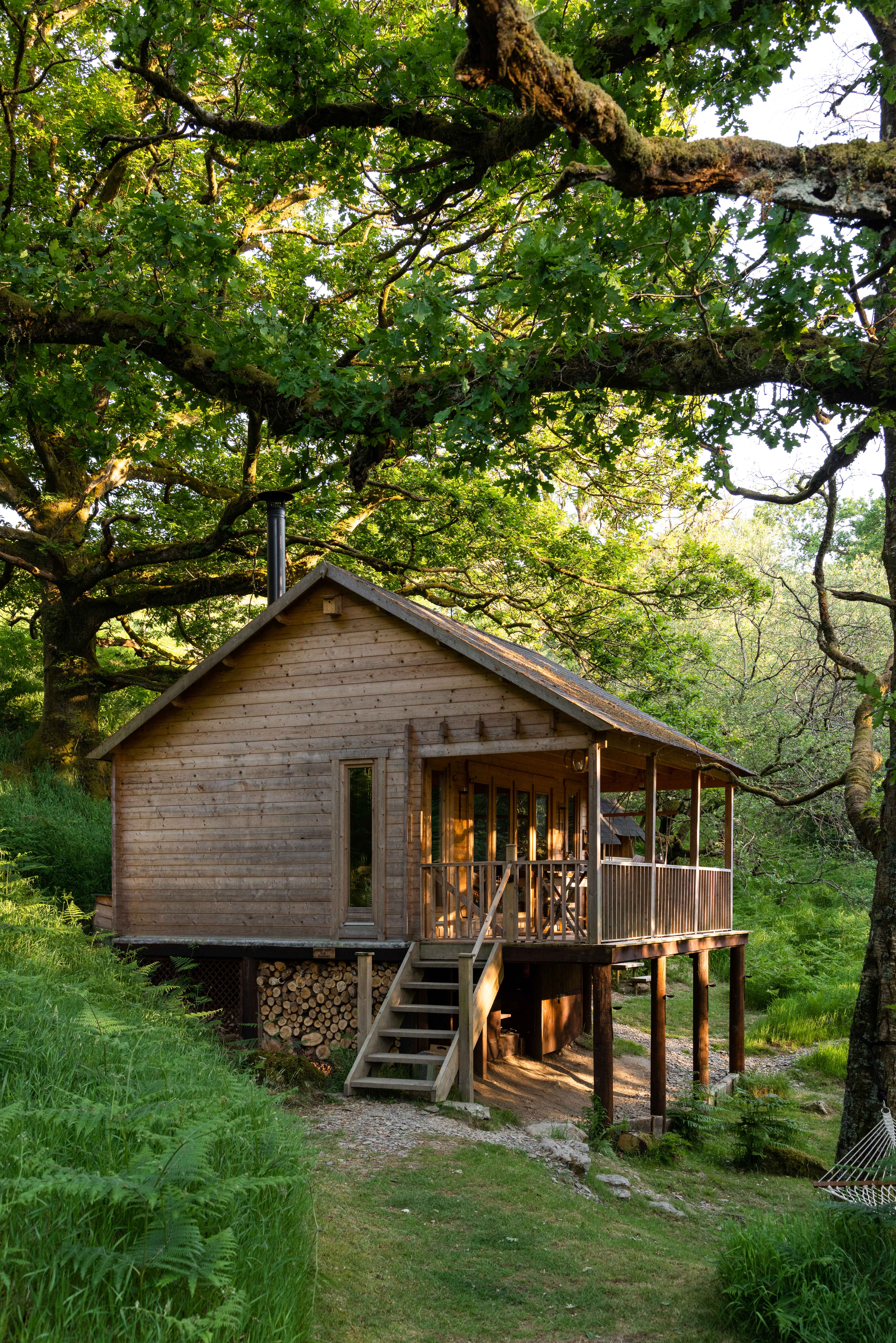 Shaded by lichen covered ancient beech and gnarly oak trees, the cabin nestles in a grassy glen on the banks of Nant Ffin stream, which cascades down to join the beautiful River Ystwyth, in the valley below.