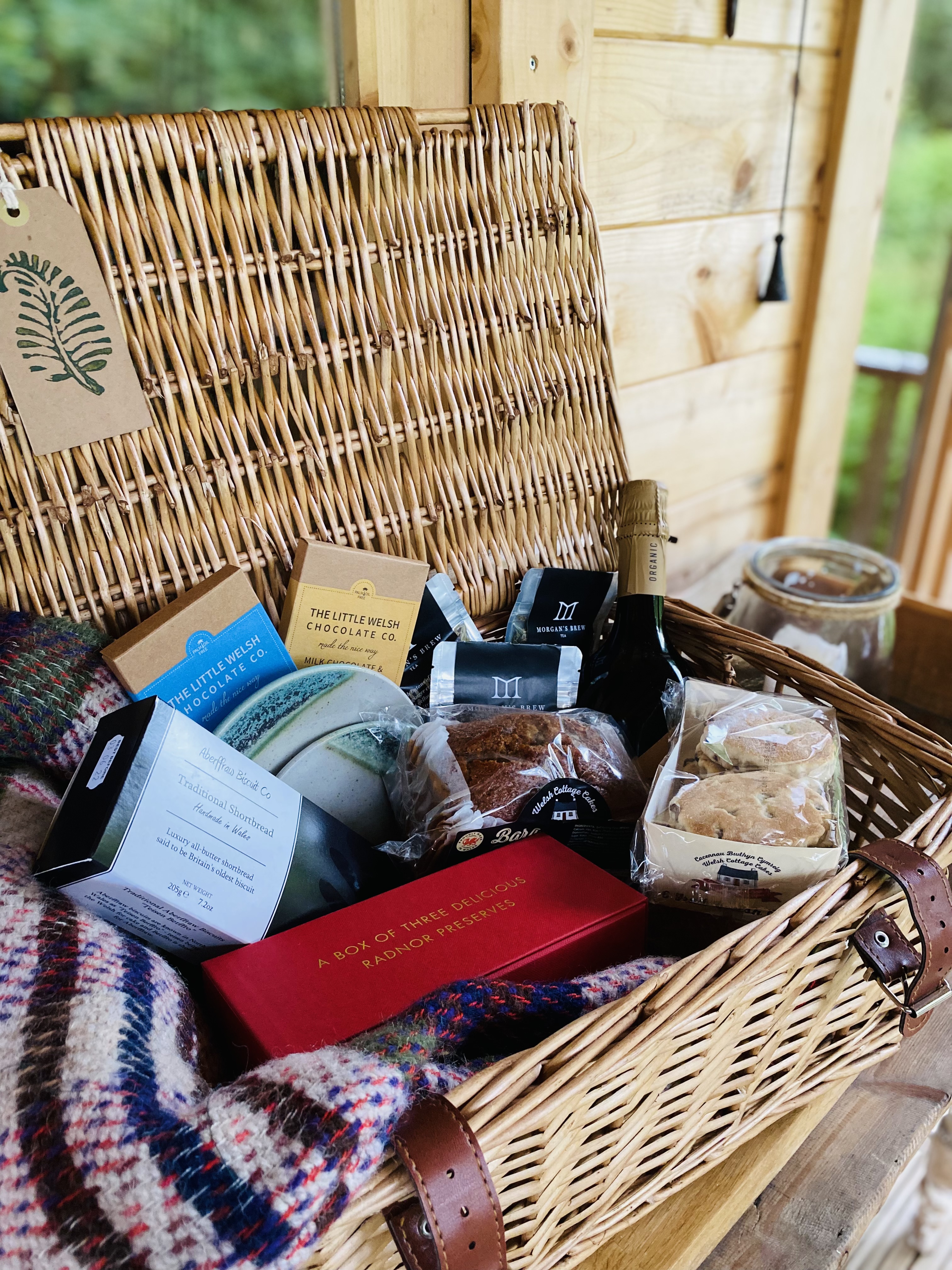 Our luxury hampers are lovingly curated by us! We source the finest Welsh, local produce for all our hampers and we are happy to make them as individual and personal as you like, so do get in touch! Some items need to be ordered well in advance, so to avoid disappointment, please order your hampers as soon as possible after booking your stay with us.